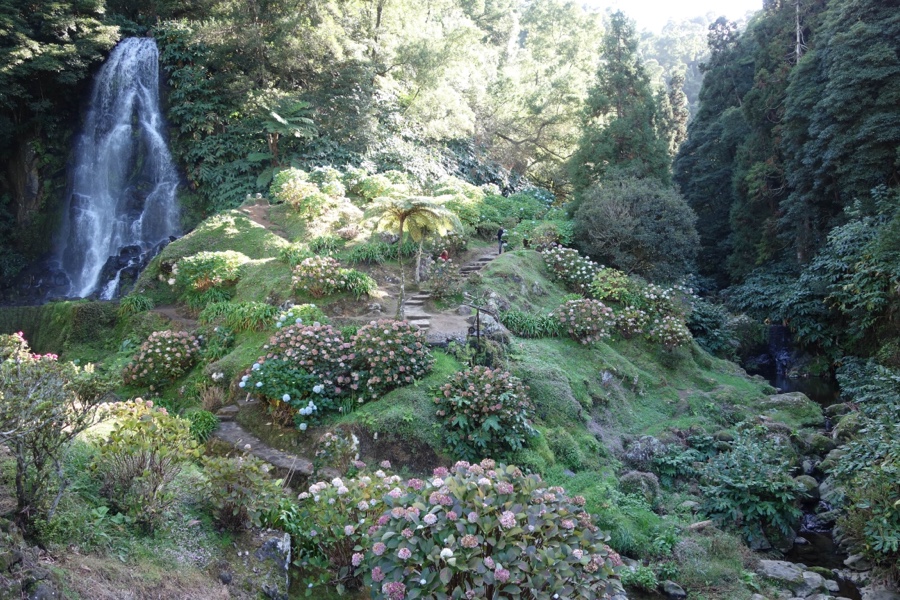 Comecemos por Porto Formoso, praia na costa norte onde desagua uma ribeira escondida na densa vegetação. Não se caminha quase nada para se ficar face a face com a sua linda cascata e pequena piscina natural, mas tão belo e tranquilo é o lugar que fazemos por nos demorar. As hortênsias teimavam ainda em manter-se de cores vivas naquele Novembro, dando uma cor que o lugar nem sequer precisa para nos alegrar. Uns trilhos rompendo a natureza pura e imaculada seguem para nos deixar numa parte mais elevada junto à cascata.