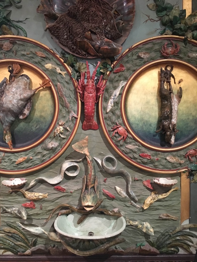 No vestíbulo à entrada para a Sala de Jantar podemos admirar o painel cerâmico da autoria de Rafael, executado na Fábrica de Faianças das Caldas da Rainha, o qual integra um lavatório.