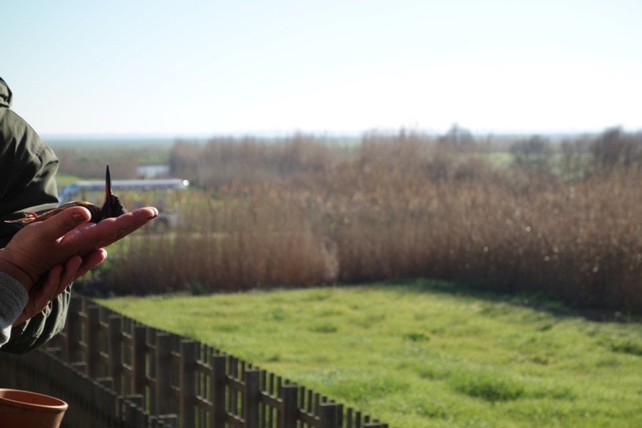 Mas porque ao Evoa vimos para observar aves, vamos então a elas. No dia em que o visitámos, antes de sairmos rumo à descoberta de parte dos 70 hectares das 3 lagoas de águas doce – a Principal, a Rasa e a Grande – que vão até à Ponta da Erva, na confluência dos rios Sorraia e Tejo, tivemos a sorte de ver libertar uma ave. Um guarda-rios tinha caído logo de manhã na rede propositadamente existente no Espaço para permitir a apanha das aves e seu posterior anilhamento, de forma a monitorizar os seus percursos, permitindo saber quantos quilómetros percorrem estas aves migratórias e até onde vão, incluindo a velocidade média que gastam a ir de um ponto para o outro. Com isso ficámos a saber que algumas das aves, se apanhadas pelos radares das nossas estradas, seriam imediatamente multadas ao voarem a mais de 180 kms/h.