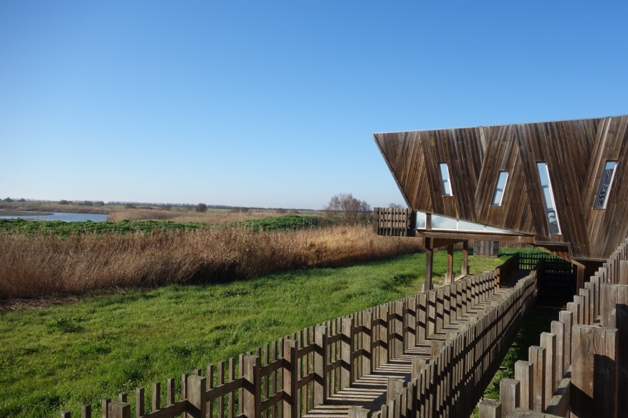 Inaugurado em 2012, o Evoa é o resultado de uma parceria entre a Companhia das Lezírias (dona dos terrenos) e a Brisa. À entrada do Evoa recebe-nos o seu belo Centro de Interpretação, numa arquitectura bem integrada na paisagem. Projecto de Maisr Arquitectos, o edifício desenvolve-se em plataformas e utiliza a madeira como material, remetendo para a ideia de juncos e paliçadas e de ambiente natural. Lá dentro, a exposição permanente dá-nos um enquadramento da história e do ecossistema da lezíria. Ficamos a saber que a abundância de recursos, o clima ameno e a localização do estuário e da lezíria atraíram desde sempre tanto as aves como o Homem. A fertilidade da lezíria, graças ao rio Tejo, era já gabada na Antiguidade e tem permitido diversas actividades como a pesca, a agricultura, a pecuária, a apanha de ostras e a extracção de sal. E o sapal e a dinâmica das marés são decisivas no equilíbrio deste ecossistema.