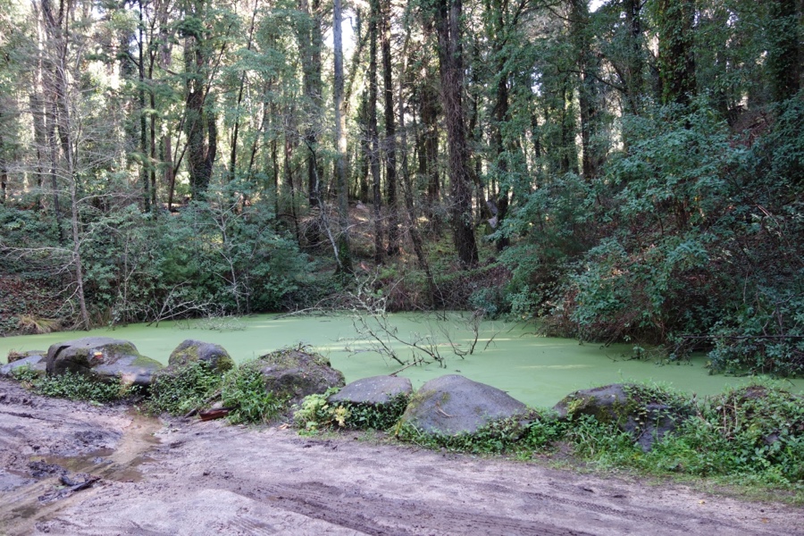 Quando acaba a descida mágica viramos à direita na estrada florestal. O denso arvoredo mantém-se, passamos por um pequeno lago com algas verdes e logo chegamos a uma mata com mesas para piqueniques. Um pouco mais para lá dela e encontramos o desvio para Adrenunes.