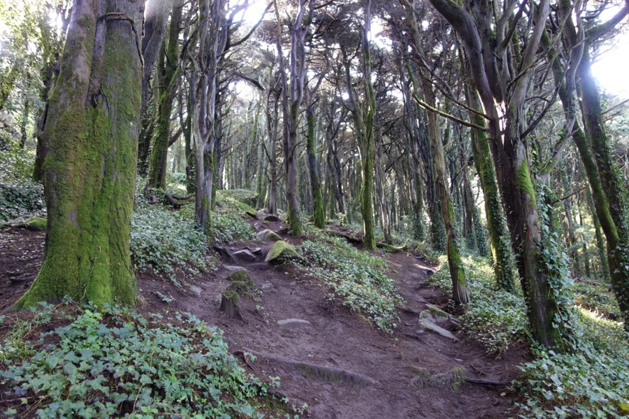 O lugar é belíssimo, todo ocupado com árvores sem deixar ver o céu, um daqueles pedaços onde se sente todo o poder e magia da natureza. Lugar fresco e escuro com raios de sol a tentarem penetrar, a humidade faz-se sentir e pingos da água soltam-se das árvores e plantas e caem sobre nós. Esta é uma zona de cupressal, com cedros do Buçaco plantados na tentativa de reflorestação da Serra de Sintra, muito sujeita a incêndios, e encontramos ainda fetos e folhas de hera.