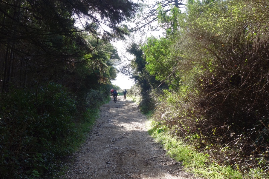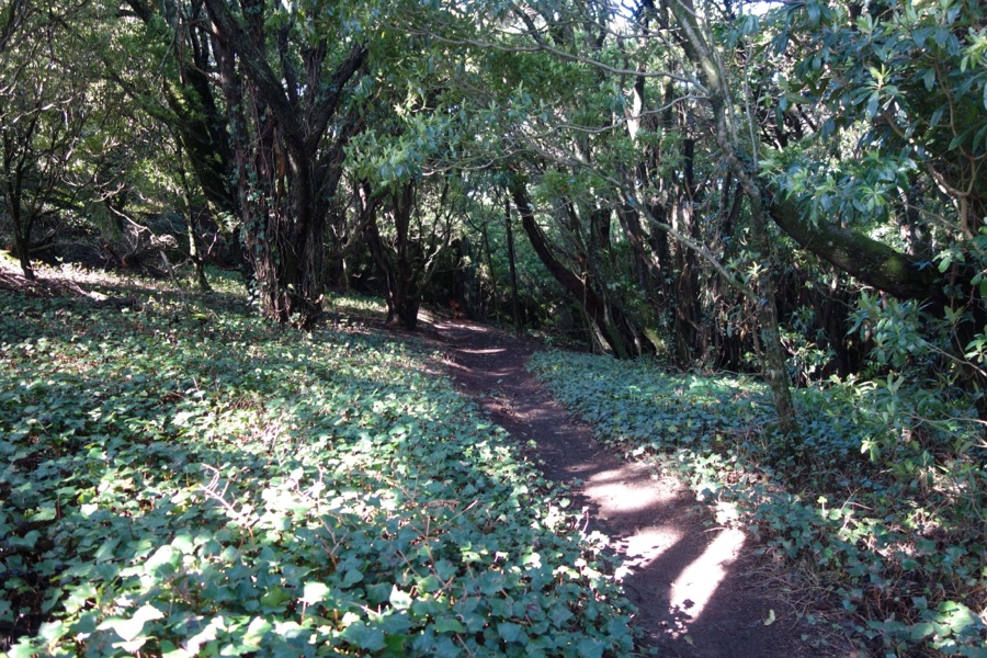 A vegetação não nos larga, mas é incrível constatar como ela vai variando na sua forma. Agora é como se o arvoredo nos fechasse, formando um túnel natural onde em alguns pontos nos temos até de agachar. E, passado um tempo, a vegetação deixa de nos cobrir, sentimos o sol forte sobre nós e ganhamos a vista de mar ao fundo.