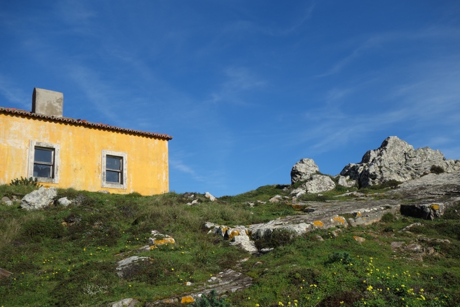 O trilho inicia-se com uma breve subida com o Santuário à nossa direita a confundir-se com as rochas e ramagem de ambos os lados. E, de repente, deixamos de ter a protecção dessa ramagem e tudo se revela. O cenário imenso da costa do Guincho aos nossos pés.