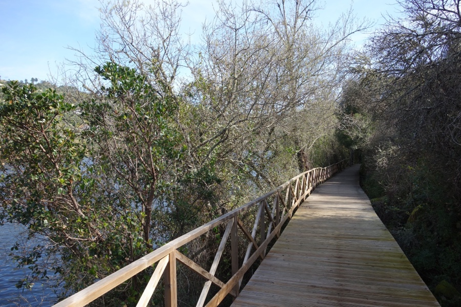 O passadiço, encostado muitas vezes à rocha de granito que faz parte da paisagem juntamente com o rio, vai ganhando forma, curvando onde tem de curvar e estendendo-se livremente onde pode. A vegetação sobre ele vai variando, com árvores, flores ou canas, zonas mais protegidas ou mais abertas. Encontramos até um pequeno e discreto curso de água a rolar sobre umas pedras com musgo verde.