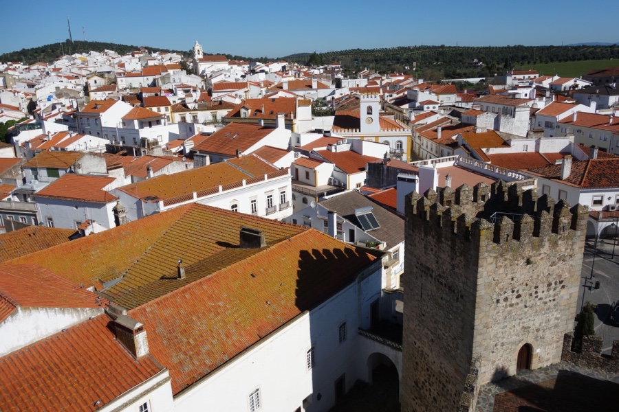 A pitoresca Torre do Relógio fica mesmo junto à Porta da Vila, bem como a Igreja Matriz. Ambas pontuadas a amarelo, como convém para este texto. Subindo alguns degraus da Torre do Relógio o amarelo deixa de dominar e o ocre dos telhados substitui-o. É uma confusão de casas que parece que mal deixa espaço para as ruas. E ao fundo a Serra de São Miguel com a sua forma pouco comum de terminar com o ponto mais elevado.