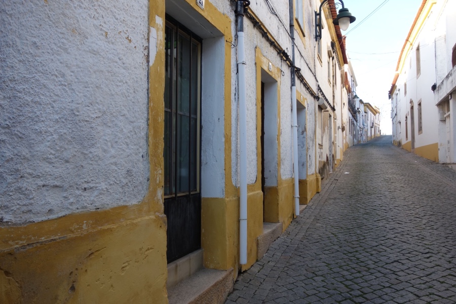 Descemos e confirmamos que, sim, as ruas são super estreitas criando uma intimidade entre os edifícios. A esmagadora maioria deles tem as tais listas amarelas e alguns preocupam-se em possuir portas e janelas de cor verde. Aqui e ali encontramos ainda detalhes decorativos nas cantarias das porta.
