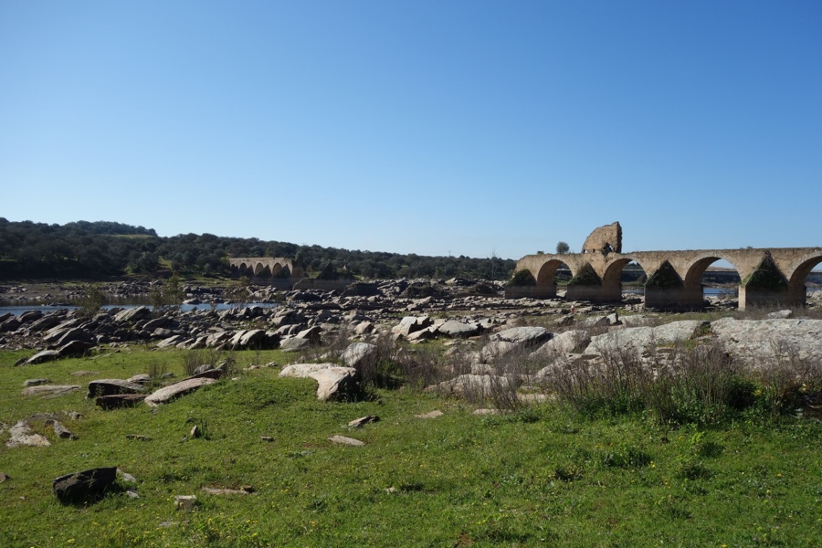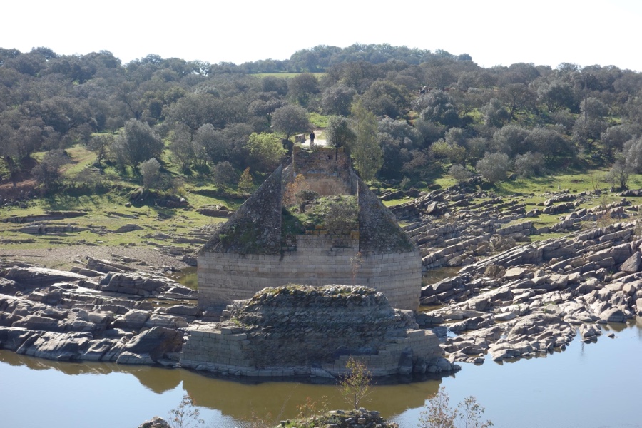 Mas, dizia, o lugar natural onde foi construída a original Ponte da Ajuda é de uma inspiração sem limites. Descemos pela Capela instalada num ponto alto relativamente ao rio e caminhamos até onde podemos pelo que resta do tabuleiro da ponte. Na outra margem, desligada, percebemos que alguém faz o mesmo que nós, cá deste lado. Meia volta e, ainda que com atenção para evitar os buracos, espreitamos e percebemos que uma criança brinca lá em baixo na água do Guadiana. Também queremos explorar o lugar por inteiro e descemos até à beira do rio. As pedras irregulares em ambas as margens são perfeitas para compor este postal de fim do mundo, onde não há dúvida de que é a natureza e o correr dos tempos quem mais ordena.