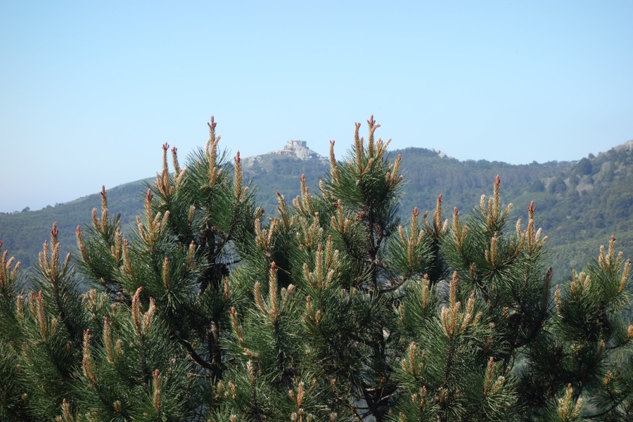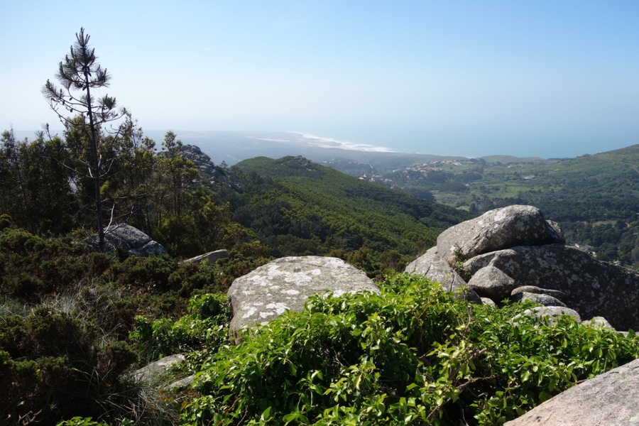 Após uma boa estirada por tapadas, num percurso circular que nos levará de volta ao ponto inicial, subimos até à Pedra Amarela. Aqui sim, as vistas são desimpedidas e soberbas. Para o Atlântico, para a Peninha, para a Pena, para tudo. O ambiente é incrível e as próprias rochas deste alto a 408 metros ajudam ao cenário.
