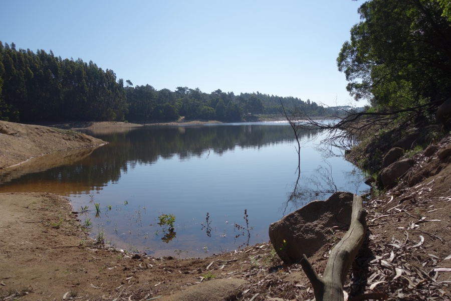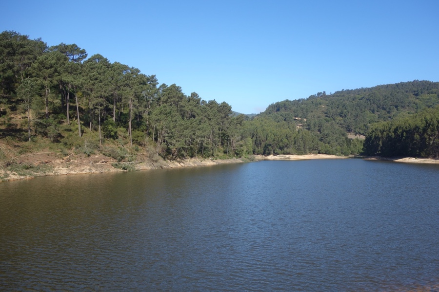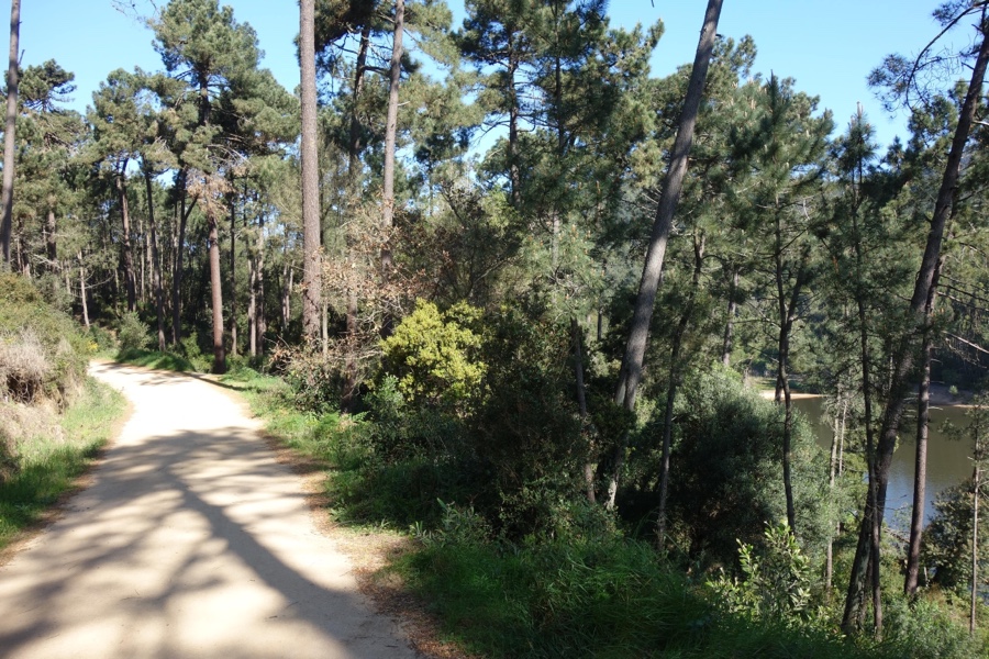 Seguimos por uma curta subida por entre pinheiros e eucaliptos com a água desta espécie de lago ao nosso lado. E haveremos de a contornar até meio, de forma a melhor observarmos a barragem de outro ângulo.