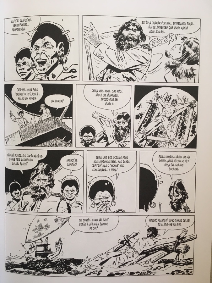 Voltando ao “A Balada do Mar Salgado”, aqui é apresentado Corto aos seus leitores pela primeira vez. A imagem do marinheiro pirata surge amarrado a uma jangada à deriva no mar, como se estivesse na cruz. Resgatado por Rasputine, há de lutar com um polvo, fugir de um tubarão e muito mais. A uma pergunta de Pandora, uma das mulheres de Corto, se acha que a sorte grande lhe vai sorrir a vida toda, responde altaneiro: “Claro, minha cara… quando era pequeno, apercebi-me de que não tinha linha da sorte. Então, peguei na navalha do meu pai e zás! Fiz uma como queria”. Pois é, a sorte é ele quem a faz.