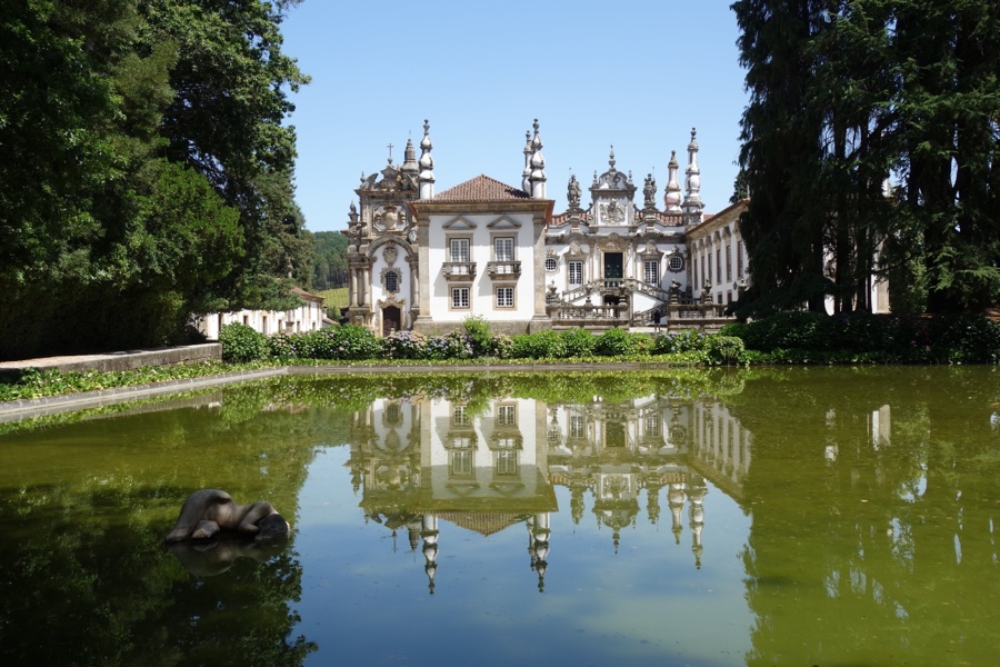 As origens do Palácio Mateus são mais remotas, mas o edifício barroco de cal branca pontuado pelo cinzento do granito que hoje podemos apreciar é uma criação do século XVIII da autoria de Nicolau Nasoni (o mesmo arquitecto dos Clérigos, no Porto). Mas o espelho de água que o enquadra – a primeira imagem que temos do lugar logo após percorremos a curta alameda carregada de árvores – é obra de Gonçalo Ribeiro Telles, já da década 60 do século passado. A imagem é belíssima, uma verdadeira obra-de arte que dispensa palavras, apenas contemplação. Depois disso, visitamos o interior da Casa (por marcação) e vagueamos pelos jardins. Muito bem decorados com arcos de buxo, canteiros e inúmeras flores coloridas, até um túnel de cedros, é um prazer apreciá-los e, depois, sentarmo-nos a uma sombrinha admirando mais uma vez a fachada traseira da Casa.
