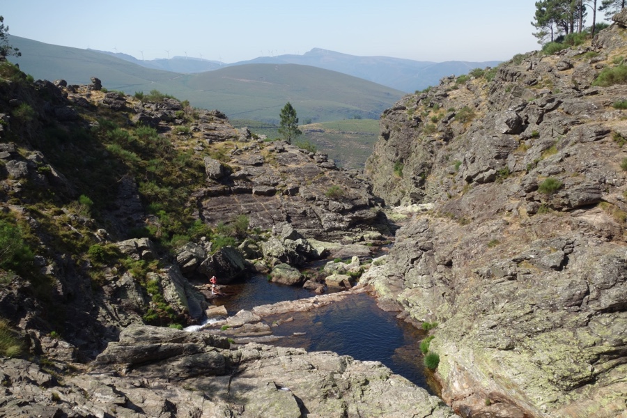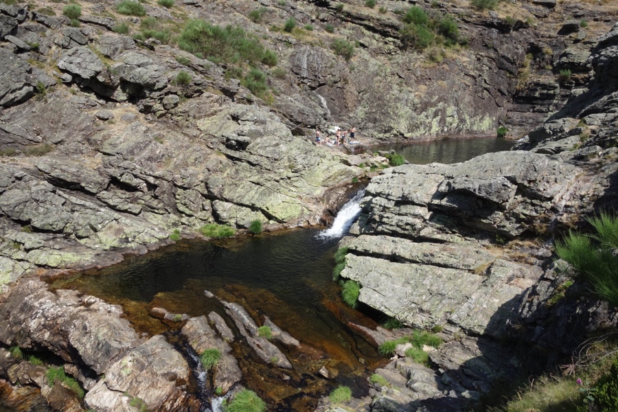 Logo vemos uma pioca mais larga, vazia de gente, e definimos que é aí que vamos querer mergulhar. Mas não nos podemos distrair com a ansiedade e com o desejo de refrescar porque nesta vertente do trilho as lascas da pedra são usadas para definir o caminho.