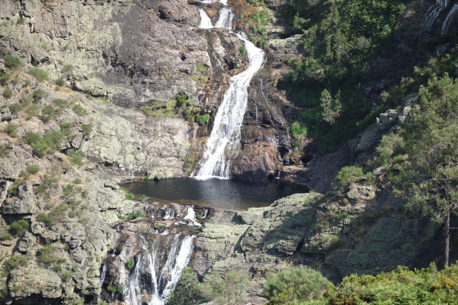 As Fisgas ainda vão longe, por enquanto percebemos pouco mais do que a tal longa espuma branca a pintar a rocha, mas mesmo à distância o barulho intenso da queda da água faz-se sentir. À medida que circundamos o percurso, agora por um trilho com uma subida menos pronunciada, e nos aproximamos das Fisgas, vamos percebendo alguns dos muitos patamares em que vai caindo e as piscinas naturais que vai formando, as piocas. Este é um fenómeno natural onde um acidente geológico originado por uma falha interrompe o curso do Olo em sucessivas quedas de água em desníveis ao longo de centenas de metros.