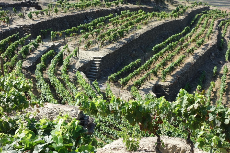 Saímos de Provesende e logo começamos a descer – uma constante ao longo de todo o percurso, daí que este trilho seja relativamente fácil para qualquer pessoa em termos de esforço físico. Caminhamos em terra batida, junto a muros de xisto, percebendo que os solos aqui são xistosos. E logo tem início o desfile de vinhas. Vinhas e mais vinhas, nunca cansam, e o passatempo perfeito é observar as várias formas das suas linhas, quase todas elas dispostas em socalcos, mas todas plantadas nas íngremes encostas. As características topográficas e climáticas do Vale do Douro fazem com que esta seja uma região óptima para a cultura da vinha. Um solo ácido, um fundo dos vales húmido e sujeito a forte radiação solar e sobretudo a exposição e a orientação dos terrenos aliado ao clima mediterrâneo de invernos frios e verões quentes e secos, eis a conjugação perfeita de factores para que esta seja não apenas uma região propícia à vinha mas também uma de excelência para a produção de vinhos do Porto Vintages.