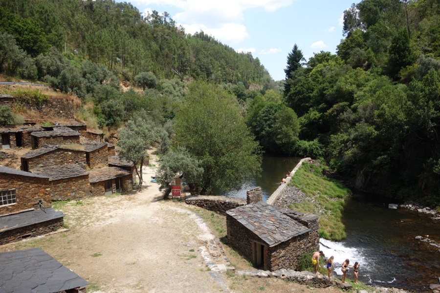 Diz que os miúdos gostam de subir as rochas e desafiar as alturas só para saltarem e caírem nas águas frescas do Ceira. Observando bem, de facto encontramos uma escada de corda pendurada numa das paredes. No entanto, há quem prefira outras aventuras, embora igualmente engenhosas, como aquele casalinho que cortou uns ramos de uma árvore para construir uma cabana que assentou à beira da água. Ficámos a saber que apesar de pouco frequentado, este é um lugar de campismo selvagem.