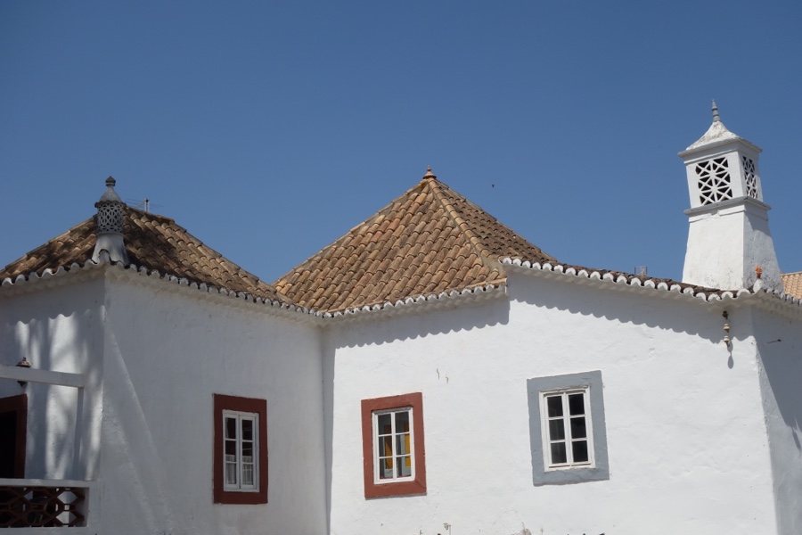 No Castelo caminhamos pelo seu belo jardim e do alto das suas muralhas apreciamos outro dos elementos que fazem de Tavira singular. Os telhados tesoura (ou de tesouro), que já tínhamos visto em Faro, parecem ser aqui a solução primeira e mais abundante no que respeita à cobertura dos edifícios. Em forma de pirâmide, com 4 águas muito inclinadas, foram trazidos para Tavira pelos comerciantes e navegadores que viajavam para paragens distantes na época dos descobrimentos, replicando na sua cidade o que viam lá fora. Mas foram usados sobretudo em edifícios pertencentes à nobreza e ao clero e, ao contrário do que se possa à partida pensar, não servem para melhor escoar a água da chuva, uma vez que no Algarve ela não é abundante, mas mais ao facto de esta estrutura permitir um melhor controlo da temperatura no interior das habitações, tornando-as mais frescas.