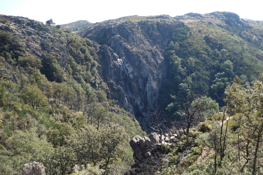 Sem esforço, após 1,5 quilómetros chegamos ao miradouro da Frecha da Mizarela. À distância, parece que apenas um fiozinho de água se despenha da imensa escarpa. O Rio Caima nasce aqui perto, na freguesia de Albergaria da Serra, a mesma da vizinha aldeia da Mizarela, e quando aqui chega cai abrupto por mais de 60 metros por conta deste corte no penhasco. A partir do miradouro vamos descer, ao encontro do curso do Caima no fundo do vale, até à aldeia de Ribeira, onde passaremos para a outra margem do rio para voltar a subir o vale pela encosta contrária.