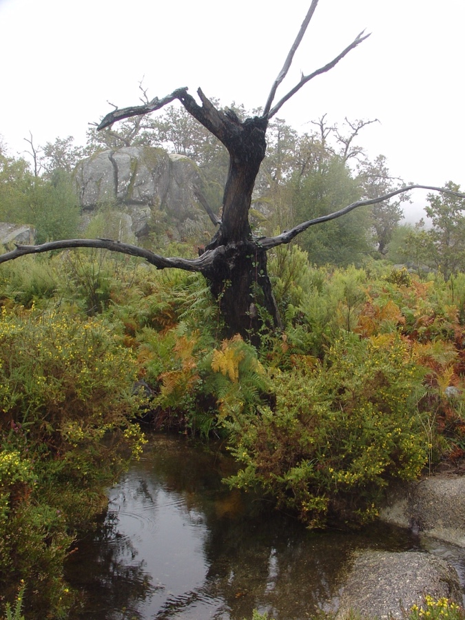 E vemos árvores negras despidas, outras inclinadas. O clima não perdoa. Indiferentes a ele, as vacas barrosãs e os cavalos garranos seguem nas suas vidas. Surpreende ver uma vaca descobrindo alimento mesmo em cima de um penedo. Outras passeiam juntas e assustam-se à nossa passagem, talvez não esperando que uns malucos caminheiros ali aparecessem com um tempo destes.