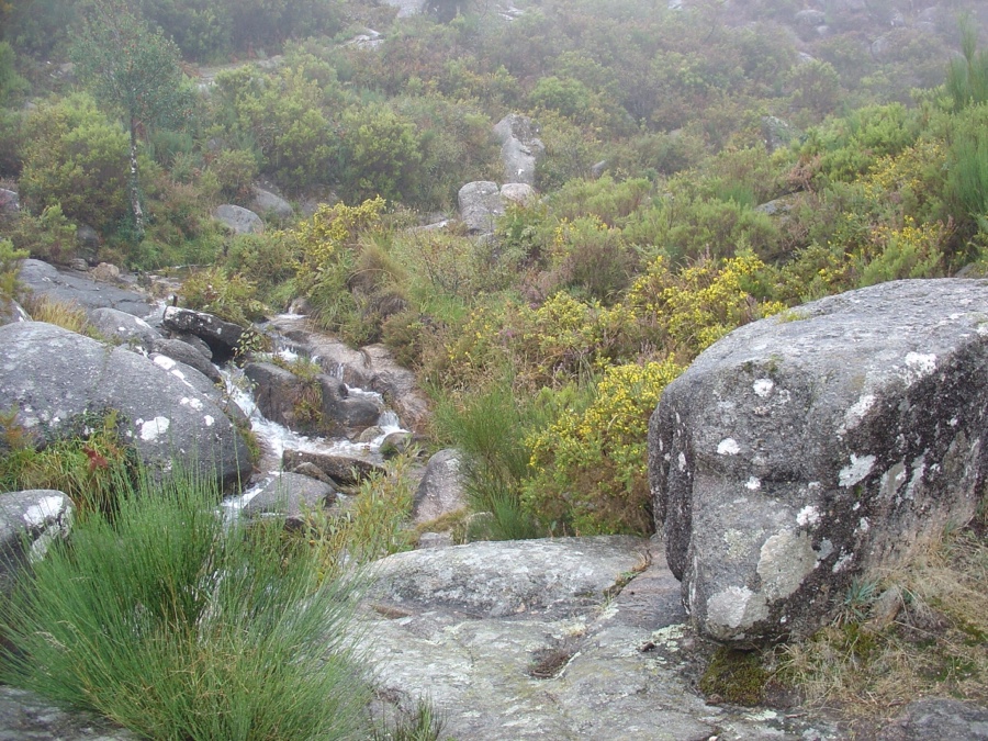 Nas costas do Santuário fica a carismática Fraga da Meadinha. A parede da Meadinha tem vindo a ser escalada por portugueses e sobretudo galegos desde a década de 1940 e é hoje a única onde se pode escalar legalmente no Parque Nacional da Peneda-Gerês. São 59 as vias de escalada desta fraga. Mas nós, apesar de a termos subido também, não o fizemos através de uma ascensão vertical, antes pelo bosque que a atalha mais suavemente. Apesar da nebulosidade intensa, as cores do bosque fizeram questão de se exibir. O penedo, esse, como é cinzento como a cor daquele dia, é que foi mais difícil de perceber em toda a perfeição. Ainda assim, conseguimos ver a água a rolar por entre as frechas da rocha, a tal que se transforma em cascata quando a queda surge mais abrupta nas costas do Santuário.