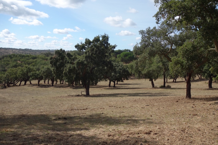 A paisagem não é menos bonita. E é sobretudo típica. Estamos verdadeiramente no Alentejo e aqui sentimo-lo bem. O montado é um ecossistema florestal que permite a coexistência de áreas de cultivo e pastoreio juntamente com a preservação dos habitats. Este é um montado de sobro e de azinho, sendo o sobreiro e a azinheira espécies de carvalhos. A cortiça do sobreiro é um símbolo de Portugal e a madeira rija e resistente da azinheira é muito procurada para diversas construções, desde vigas a embarcações ou até barris para envelhecimento de vinhos. Ambas dão como fruto a bolota, servindo esta de alimento para o porco de montanheira, também conhecido como porco preto alentejano – não encontramos porcos mas vimos muito gado bovino. Para além disso, estes montados são dos habitats mais ricos em biodiversidade, acolhendo centenas de espécies de aves que aqui vêm para nidificar.