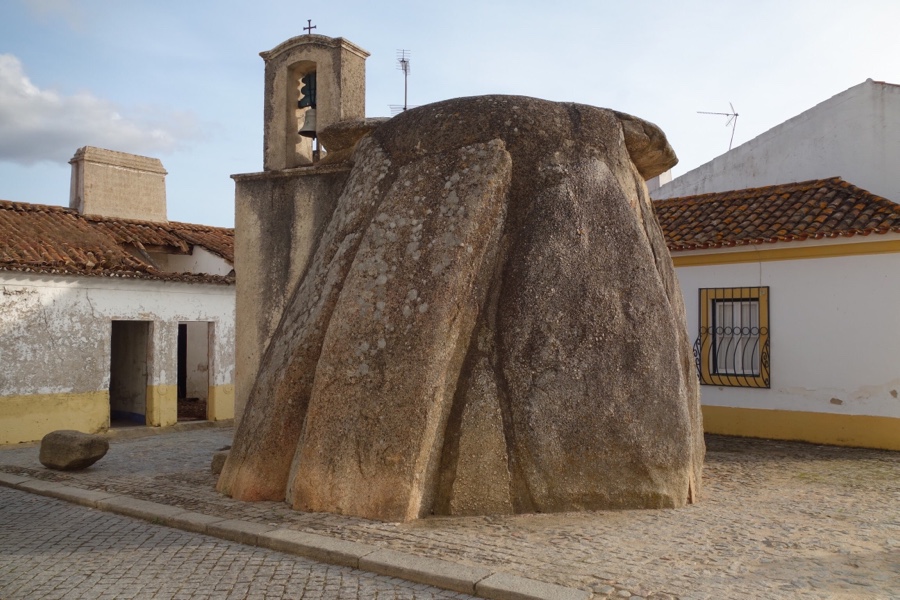 Mas a grande atracção de Pavia encontramo-la logo à entrada, com a imagem da sua Anta-Capela. Este é mais um exemplo do megalitismo da região – o primeiro monumento megalítico referenciado na bibliografia histórica, já no século XVI – e um dos mais formosos e curiosos. A anta acabou por ser reutilizada como espaço cristão no século XVII e é hoje a Capela de São Dinis, com entrada de um lado, onde foi erguido até um campanário, e a rocha dólmen do outro.