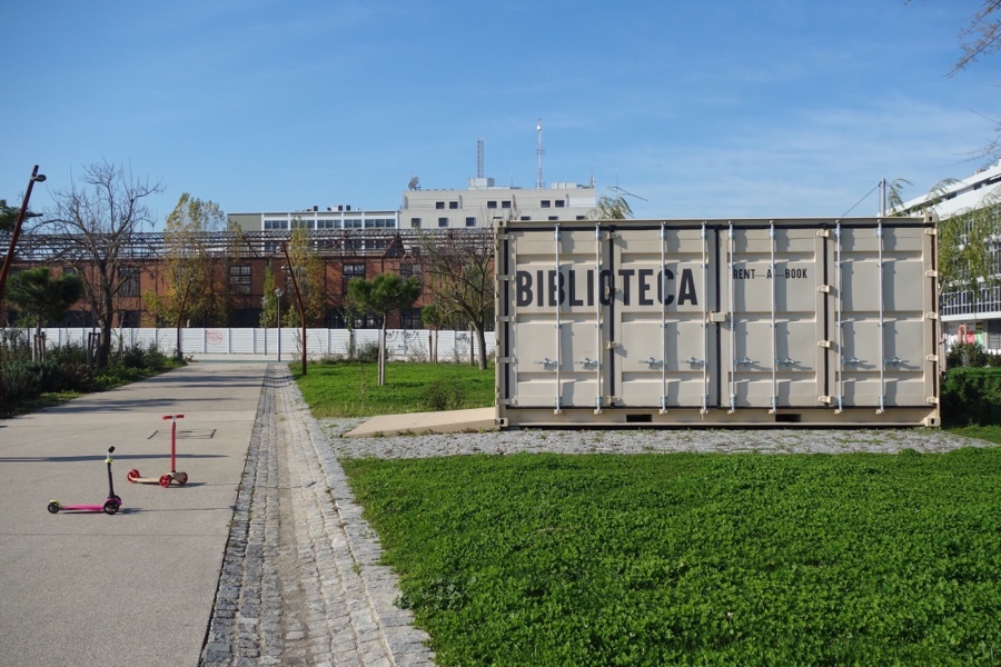 Os apoios do parque, como wc, cafetarias, aluguer de bicicletas e biblioteca, estão todos instalados em contentores marítimos reconvertidos para o efeito, mais uma alusão à memória do lugar.