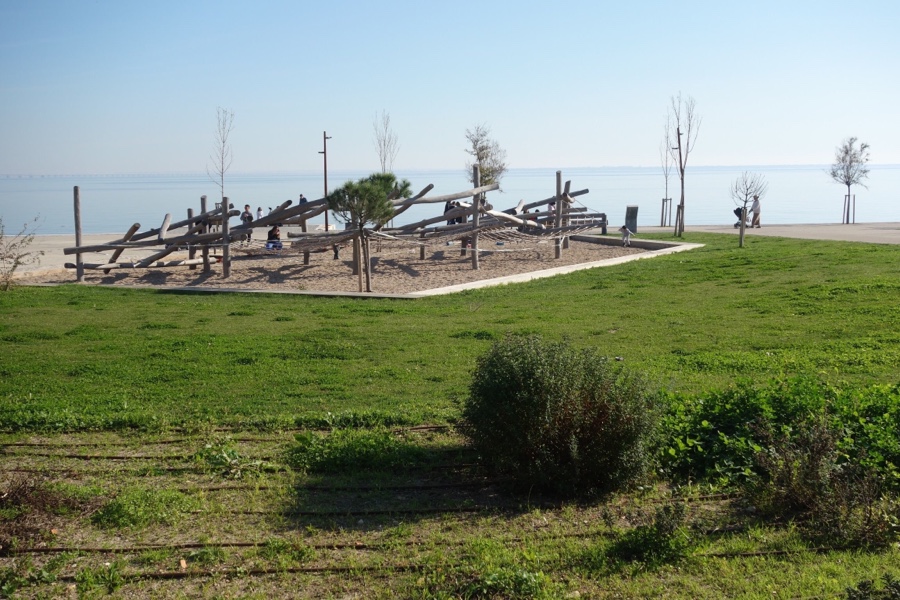 Projecto das arquitectas paisagistas Filipa Cardoso de Menezes e Catarina Assis Pacheco, do atelier F | C, os seus detalhes são perfeitos, já se disse. O parque para os miúdos está instalado na areia e é uma estrutura para trepar feita de troncos e redes de cabos de aço que se levantam e entrecruzam, aludindo à imagem dos mastros dos barcos e das redes de pesca que eram presença no rio.