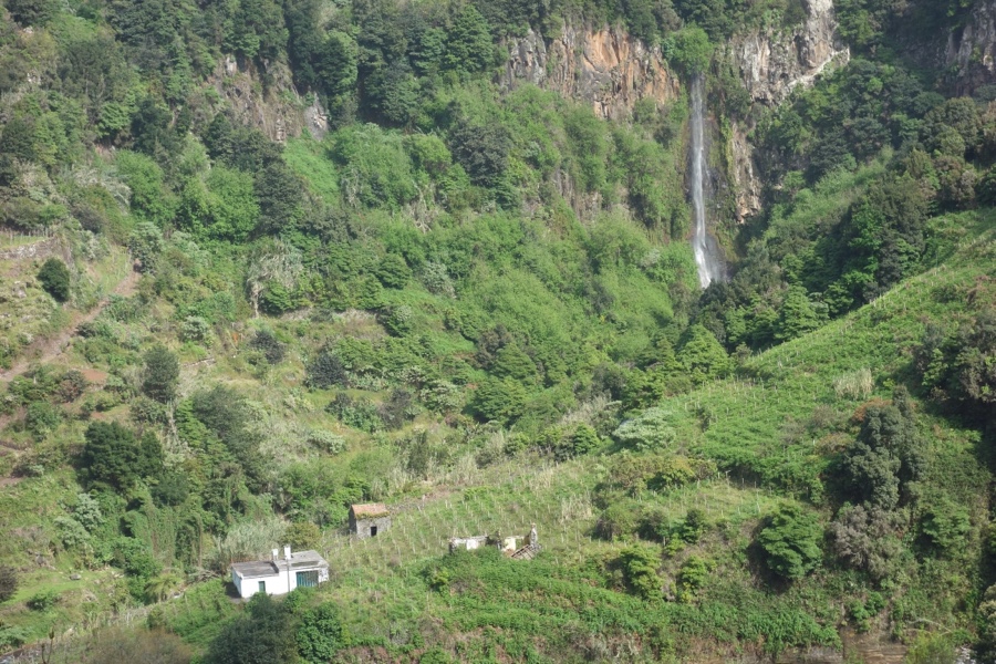 Estamos já na Área Protegida da Ponta do Pargo. Antes de chegar ao ponto mais ocidental da ilha, uma paragem para admirarmos plenas de emoção uma última queda de água, a da Garganta Funda. Os adjectivos já estavam esgotados, pelo que restou abrir a boca de espanto mais uma vez diante dos cerca de 140 metros de altura desta queda, uma das maiores da Madeira.