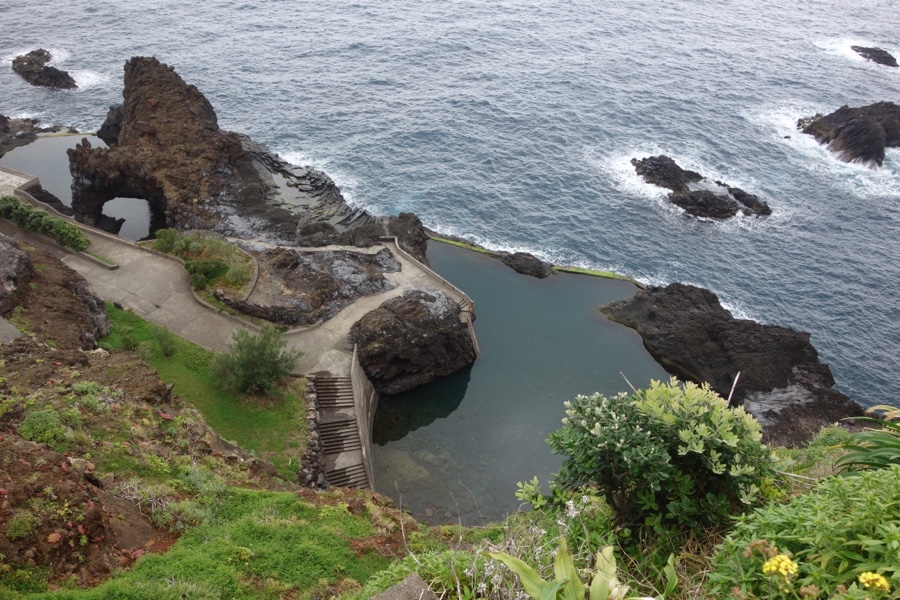 E assim chegamos ao Porto Moniz, em cuja Ponta do Tristão fica o ponto mais a norte da ilha da Madeira. A vila é mais conhecida pelas suas piscinas naturais de origem vulcânica, mas a sua implantação geográfica, bem observada do miradouro que desce para a povoação, é bem bonita. Ao negro das rochas formadas pelo basalto da lava que cercam as piscinas junta-se a igualmente negra muralha do forte que em tempos protegia o Porto Moniz.