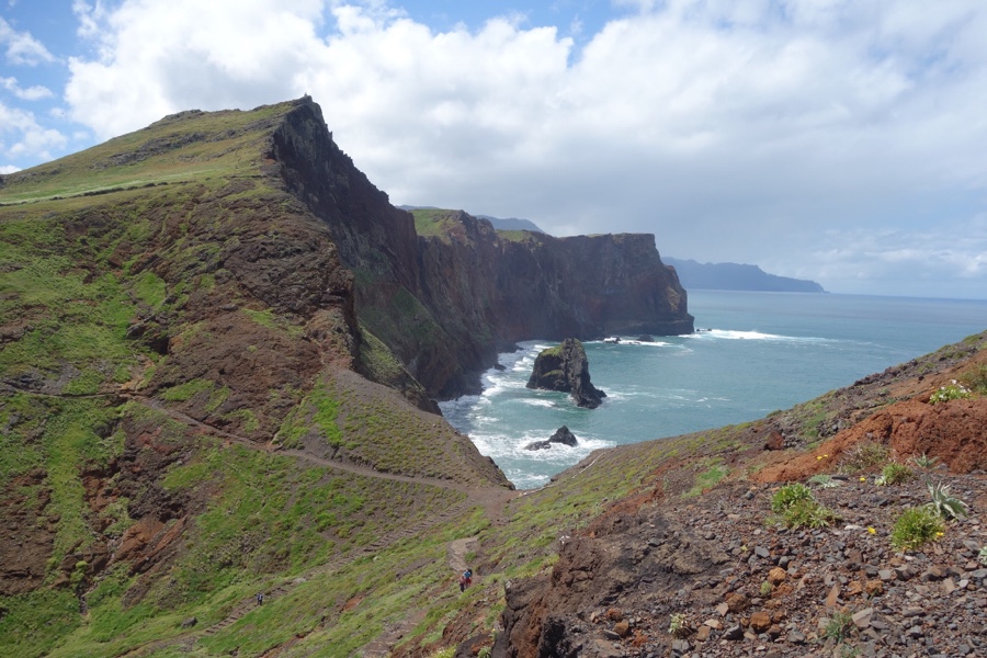 Para a esquerda ergue-se o Morro da Piedade, um cone vulcânico onde se chega tomando um desvio no trilho, caminho a ser tomado igualmente para quem quer seguir a direcção da costa nordeste. Não o subimos, mantivemo-nos no nosso trilho, e logo ganhámos a primeira perspectiva da costa nordeste. Uma perspectiva incrível das tais escarpas, falésias pronunciadas que descem abruptas para o mar, com veios que acentuam a sua rudez. Percebe-se a diferença nos rochedos rente ao mar da costa sul e da costa norte, sendo estes mais brutos pela maior e mais violenta ondulação, que vai erodindo e moldando as escarpas e formando pequenos ilhéus.