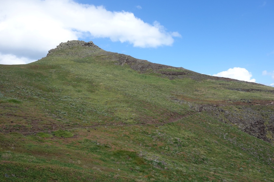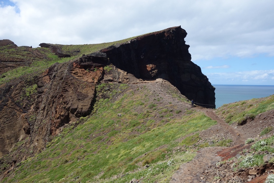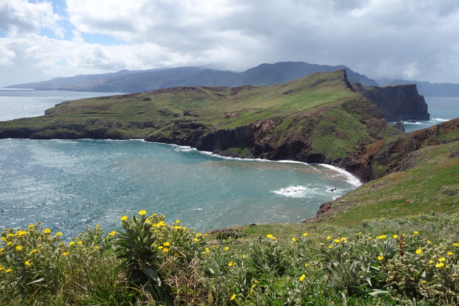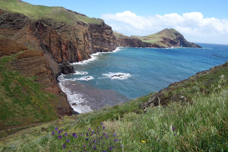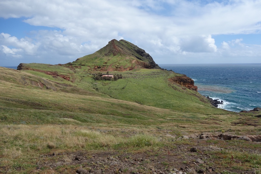 Após uma passagem mais estreita por uma língua de terra, chegamos à parte mais larga da península. Para diante à esquerda, logo se ergue um monte de forma gentil, parecendo totalmente liso e coberto de um verde feito de feno. Apesar da Ponta de São Lourenço ser reconhecida pelo seu fantástico recorte de costa, foi este cenário que mais me entusiasmou e que guardarei para sempre na memória.