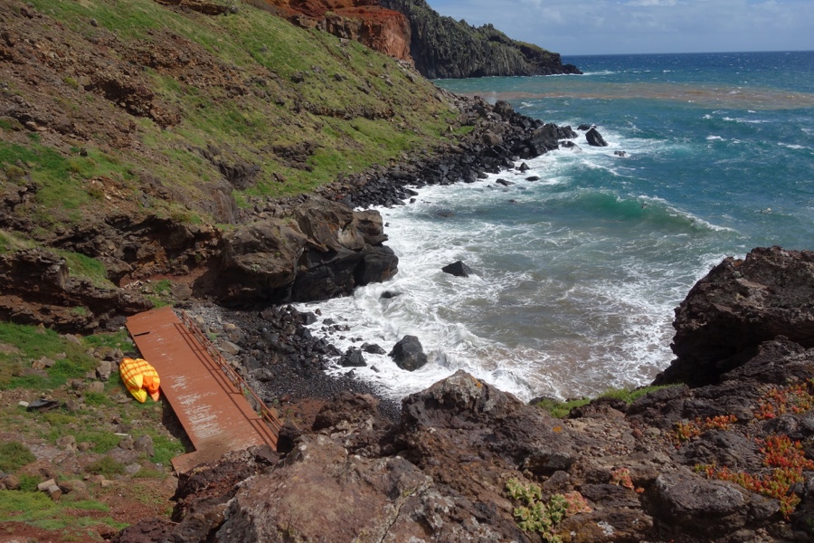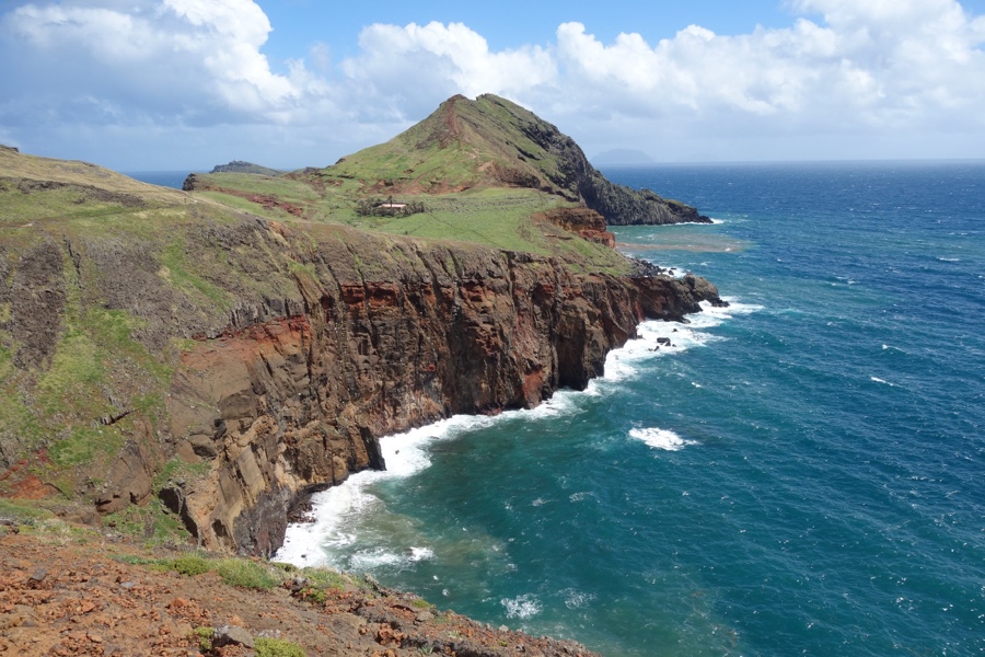 Passamos pelo Cais do Sardinha, um pequeno ancoradouro que serve igualmente de entrada para uns mergulhos no mar quando este o permite, e chegamos, enfim, à Casa do Sardinha. A Casa do Sardinha, rodeada de palmeiras, toma o nome de família dos seus antigos proprietários que aqui tinham um refúgio de lazer. Hoje é um dos centros de recepção do IFCN e serve de apoio aos vigilantes do Parque Natural da Madeira. Este é o ponto final do trilho oficial e a partir daqui a manutenção tem sido escassa, mas à nossa responsabilidade acabámos por continuar mais ao longo da península. Mas, na verdade, esta falta de manutenção não torna o trilho nem difícil nem perigoso, tendo subindo sem grandes problemas os 500 metros que nos deixam no alto do Morro do Furado, onde fica o miradouro mais grandioso da Ponta de São Lourenço. O vento aqui faz-se sentir mais forte do que em qualquer outro ponto do percurso.