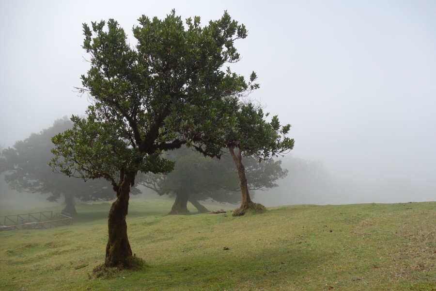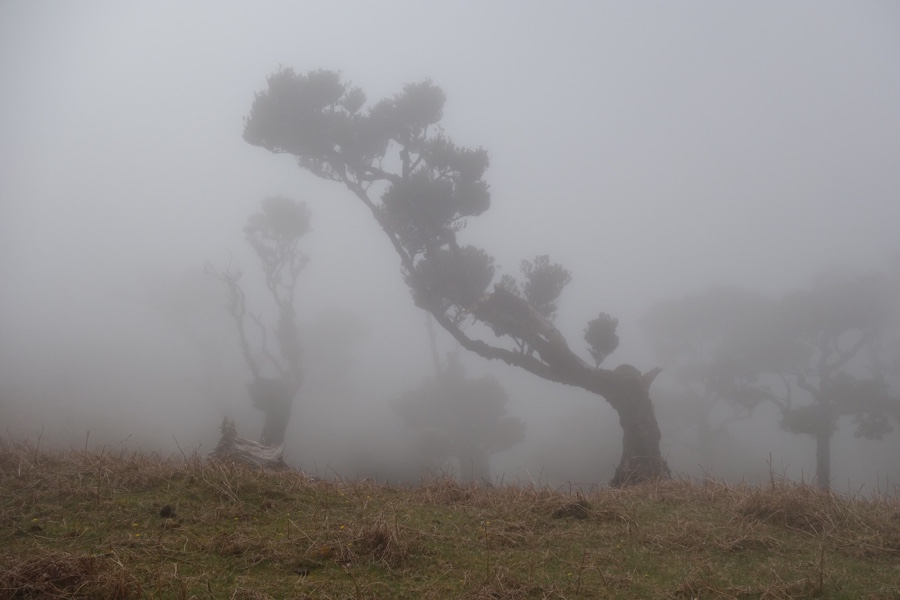 E, em pouco tempo, à aproximação do final da floresta o cenário muda uma vez mais. Passamos a caminhar por uma planície de pastagem, mas não vemos nenhumas vaquinhas. O nevoeiro vai cerrando e os miradouros nesta zona com belas vistas para a costa norte (povoações do Seixal e da Ribeira da Janela) passam a meras promessas. Nesta vereda do Fanal somos previamente alertados para o nevoeiro que aqui amiúde assenta arraiais e que faz com que os caminhantes se possam perder no caminho – é, pois, indispensável fazer-nos acompanhar de gps. Mas olhando aquele céu azul do início da caminhada julgámos impossível que outro tempo nos pudesse tocar. Os humores do clima, com suas mudanças repentinas, fazem parte da graça do Fanal. Mesmo no final, já na descida para o Parque Florestal, a 1150 metros de altitude, tocou-nos apreciar a bela colecção de tis retorcidas com o nevoeiro como padrão de fundo. Beleza pura; uma atmosfera incrível. Ficamos a pensar que foi melhor assim, ter esta imagem mágica cheia de mistério, algo que os raios de sol nunca poderiam conferir-lhe. E, então, ficamos com a certeza de que os madeirenses é que a sabem toda, ter o Fanal como lugar de eleição. Havemos de voltar para o rever envolvido em nevoeiro e conhecê-lo sob o domínio do sol.