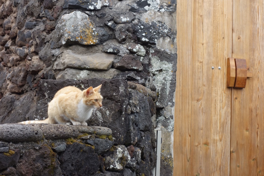 Foi também para defesa dos ataques dos piratas que o núcleo antigo da Vila do Corvo foi construído sob a forma de ruinhas estreitas e labirínticas. Dizia Raul Brandão que eram “meia dúzia de ruelas fétidas, algumas com meio metro de largura”, “tudo tão humilde, tão feio, tão só, que me mete medo”. Esta descrição do autor na década de 20 do século passado foi incompreendida e marcou fundo a alma corvina. Certamente injusta, uma vez que a Vila do Corvo não seria muito diferente da maioria das aldeias continentais de então. E, nisso, evoluímos todos enquanto país uno, ainda que com umas aldeias mais distantes e isoladas do que outras. A verdade é que os adjectivos negativos não se aplicam já, pudemos confirmar; restam apenas as humildes ruelas com meio metro de largura. As típicas canadas, muitas delas com vista para o oceano. O coração da urbe tem muitas casas em ruína, mas a maioria está bem conservada e mantém-se como um belo testemunho da especificidade arquitectónica corvina. As suas casas estão concentradas, junto ao Porto, protegidas do vento, em terrenos que seriam menos favoráveis à agricultura, e a sua frente está virada para trás, orientada para sul – há quem goste de pensar que é para combater o isolamento e dar algum consolo, ficando os corvinos com vista para o único território nas “imediações”, a ilha das Flores. A casa vernácula do Corvo é uma casa rural, rectângular ou em L, com dois pisos e cozinha no térreo (uma singularidade no arquipélago). Com telhados de duas águas, as paredes são em alvenaria de pedra vulcânica local, com as mais antigas com a pedra escura à mostra e as mais recentes caiadas, e as janelas de guilhotina. Ainda que tradicionais, estamos longe das primitivas “casas palhaças”, por cobertas de palha, apontadas por Gaspar Frutuoso no século XVI. A sua fechadura de madeira é única e, a par da barreta azul corvina, uma peça de artesanato exclusiva da ilha. Não é difícil encontrar um montão destes exemplares enquanto caminhamos pelas ruas e espreitamos pelas canadas. O que não é fácil é evitar o encontro com um dos muitos gatos que por lá também vagueiam: vêm ao nosso encontro e enroscam-se dóceis aos nossos pés. Uns oferecidos, estes gatos corvinos.