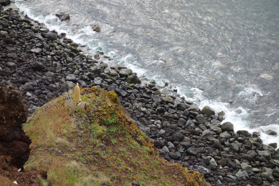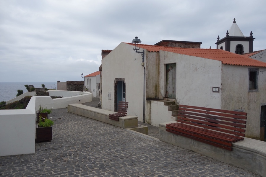 Mais no interior da ilha, acima da Vila, seguimos em direcção ao miradouro da Cara do Índio, rocha de basalto que foi sendo esculpida pela erosão até tomar uma forma que com imaginação se vislumbra a cara de um índio. A rocha há de ficar na costa no seguimento a norte da Ponta do Topo, mas o miradouro tem um trilho próprio. O vento e o nevoeiro cerrado impediram que pudéssemos descobrir a figura. Mas fomos até onde nos deixaram, o suficiente para darmos com uma das melhores vistas para a Vila, um lugar que tem até um banquinho para nos deixarmos estar a contemplar o que nos calhou em sorte.