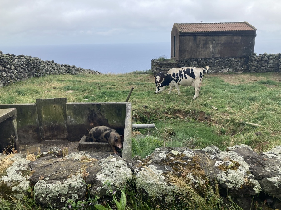 Não é preciso subir muito rochedo adentro para entrarmos num outro mundo, o da ruralidade – que, aliás, já se vai vendo nos quintais da vila. A estrada até ao Caldeirão tem logo ao início uma série de palheiros, onde os pastores guardavam as suas ferramentas, junto aos terrenos de cultivo e de pastoreio, divididos por característicos muros de pedra. Antes cultivava-se sobretudo trigo, hoje batata doce, batata, hortaliças, milho e feijão. Antes havia sobretudo pastos de gado ovino, hoje gado bovino. Eram tantas as ovelhas que estava instituído o “dia da lã”, o dia em que, em conjunto, os homens da ilha saiam a reunir todo o gado ovino para procederem à sua tosquia. Um dia de festa, pois. Agora são as vacas que pontuam a ilha, espalhadas maioritariamente pelo baldio que preenche 50% ilha, incluindo o Caldeirão.
