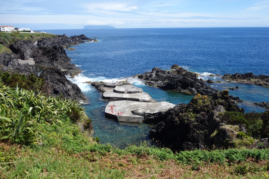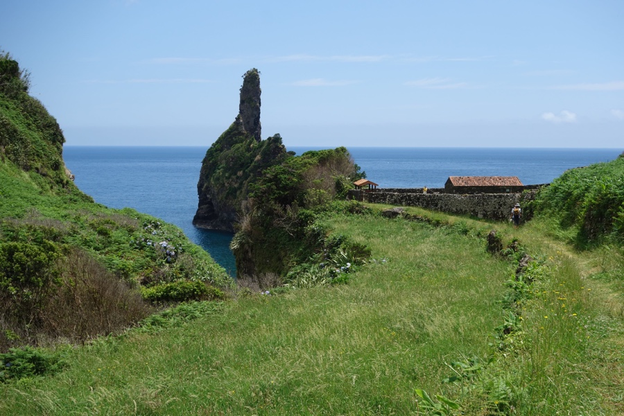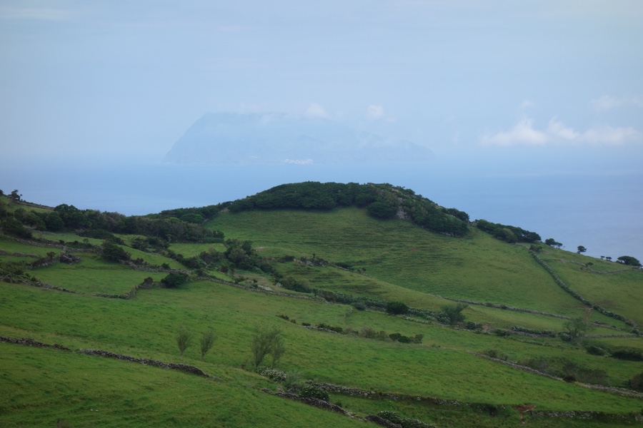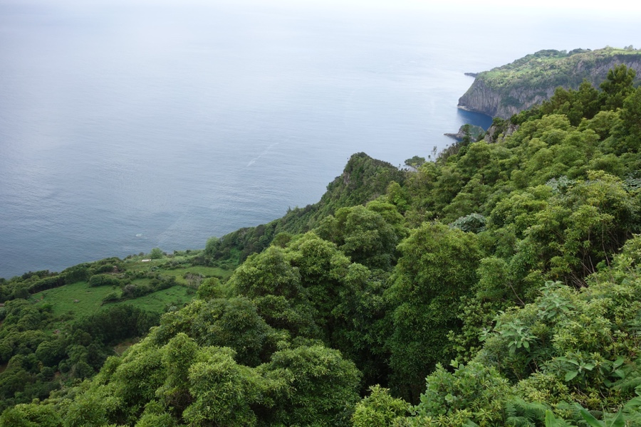 Seguimos, então, pela costa nordeste, numa estrada cheia de belas vistas, quer para os montes ondulados e verdíssimos no interior quer para o mar largo onde é uma emoção descobrir o Corvo ao fundo. As falésias altas dominam, chegam a atingir os 600 metros, e a costa é recortada por baías e enseadas. E o mar está carregado de ilhéus.