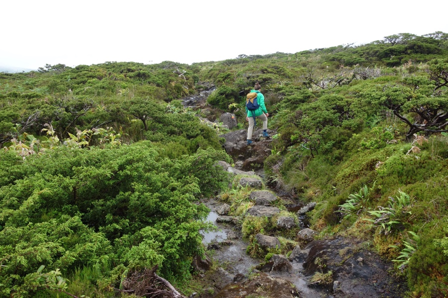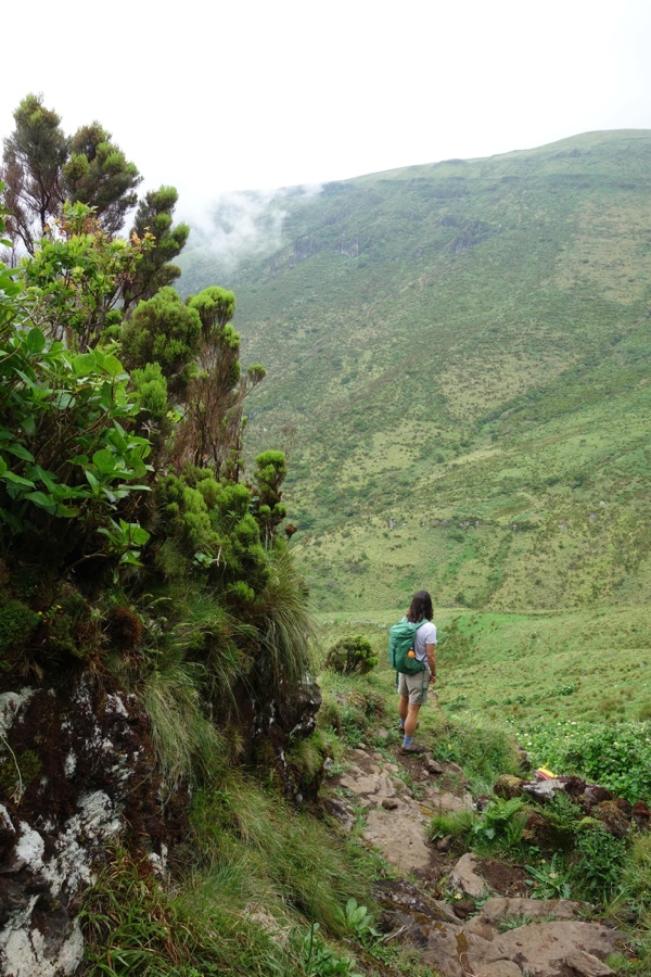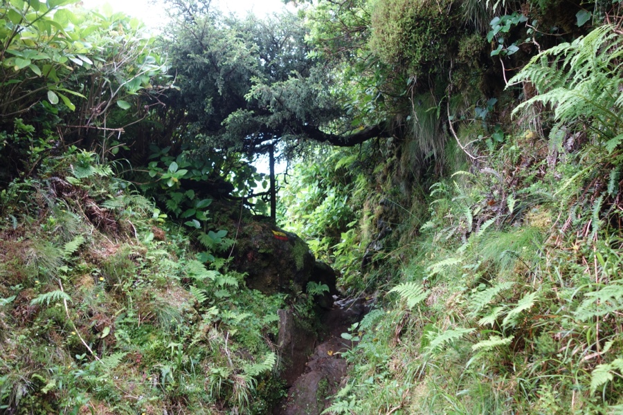 E é a partir daqui que começamos mesmo a perguntar-nos se achávamos que já tínhamos visto muitas cores de verde. O facto de ser uma zona húmida e de nevoeiros proporciona esta panóplia de cores, a que se juntam amarelos. Ora pisando um trilho de terra ora de pedra, é impossível evitar encharcar o calçado de água. Mas se o mais certo é pormos o pé na poça, há que ter toda a atenção para não escorregar.