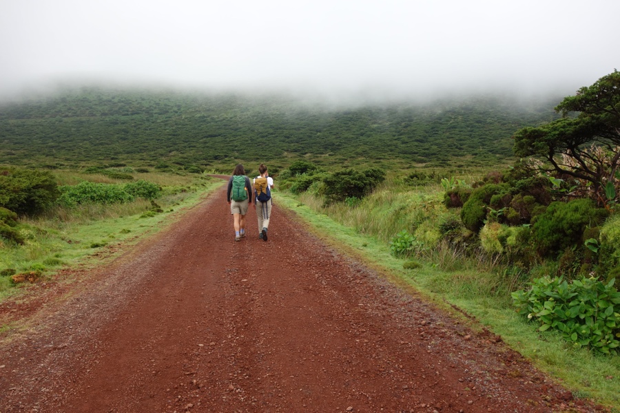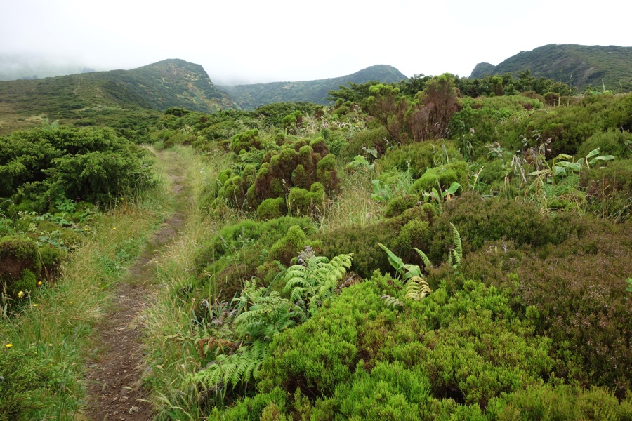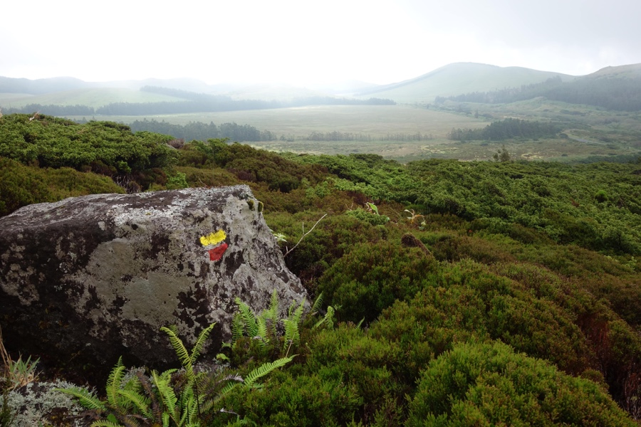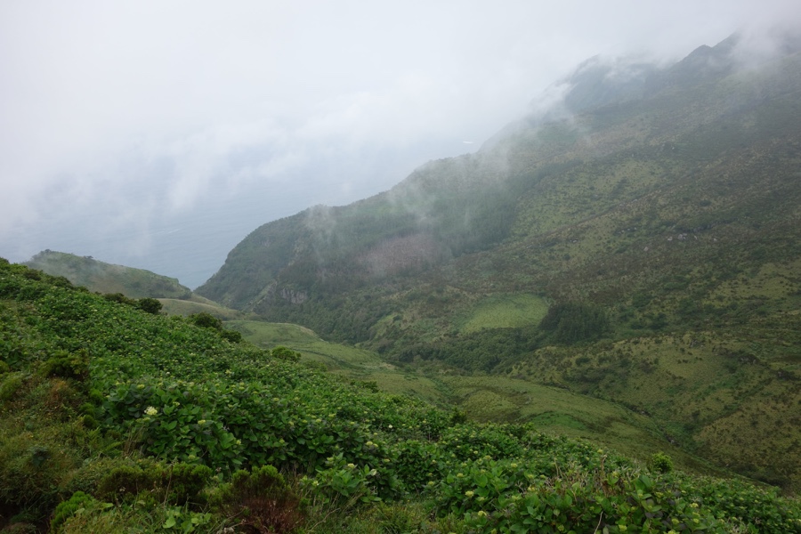 A 620 metros de altitude deixamos a estrada de bagacina e desviamos para novo trilho. Daí a 3 kms estaremos ao nível do mar. Graças ao nevoeiro que por ali estava assente, do primeiro quilómetro pouco pudemos perceber – valha que o trilho estava bem marcado, com as tradicionais riscas amarela e vermelha a aparecerem com frequência. Mas, de repente, ainda com as nuvens ao nosso nível e até abaixo de nós, avistamos o Atlântico e a falésia que guarda a Fajã Grande: é para lá que vamos.