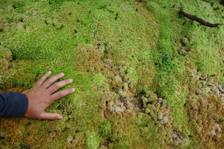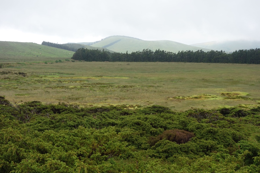 A vegetação rasteira continua intensa, mas é o sistema de turfeira que mais rouba a nossa atenção. É na ilha das Flores que encontramos as mais antigas e extensas turfeiras, um ecossistema típico de zonas húmidas que funciona como esponja e pode acumular até 20 vezes o seu peso em água. O musgão é extremamente cativante e dá vontade de tocá-lo e senti-lo, de tão bonito e fofo que é.