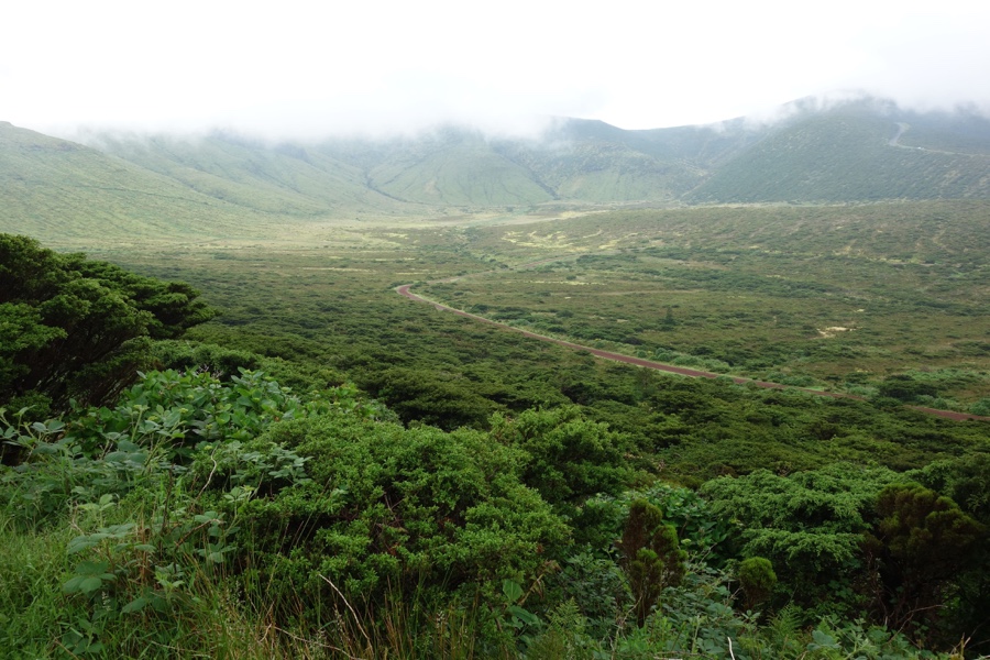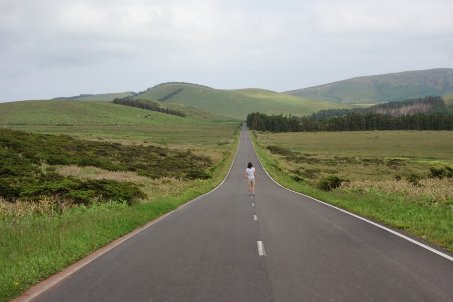 No final da Lagoa Comprida atravessamos a estrada, uma longa recta que se propõe a que apreciemos demoradamente a paisagem feita de montes e de verde que tão bem caracteriza a ilha das Flores.