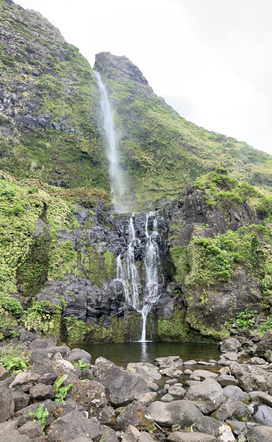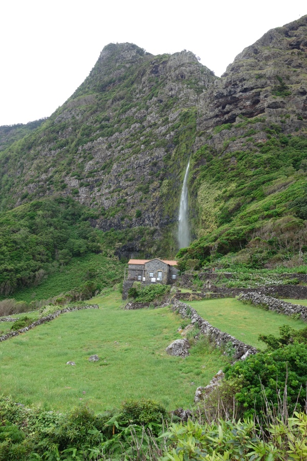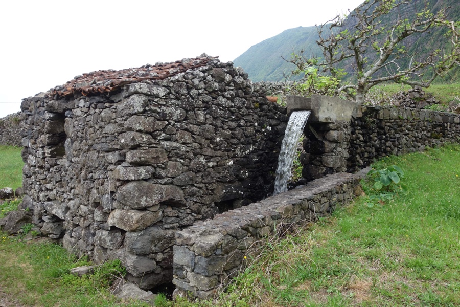 Estamos na Fajã Grande e chega a vez das enormes quedas de água que jorram falésia abaixo se tornarem as protagonistas da caminhada. A primeira delas, acessível por um caminho de pedra muito bem arranjado e ladeado por uns moinhos antigos, é o Poço do Bacalhau.