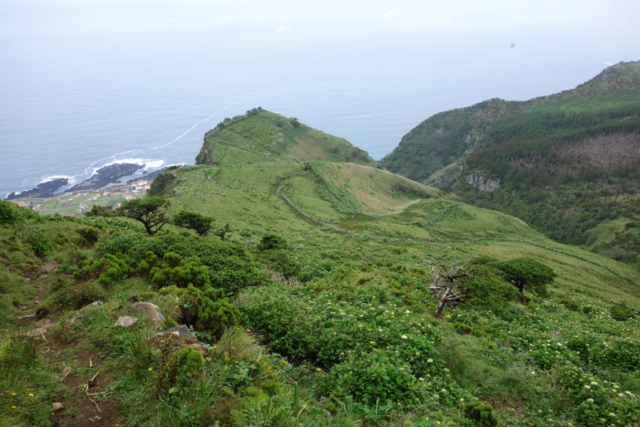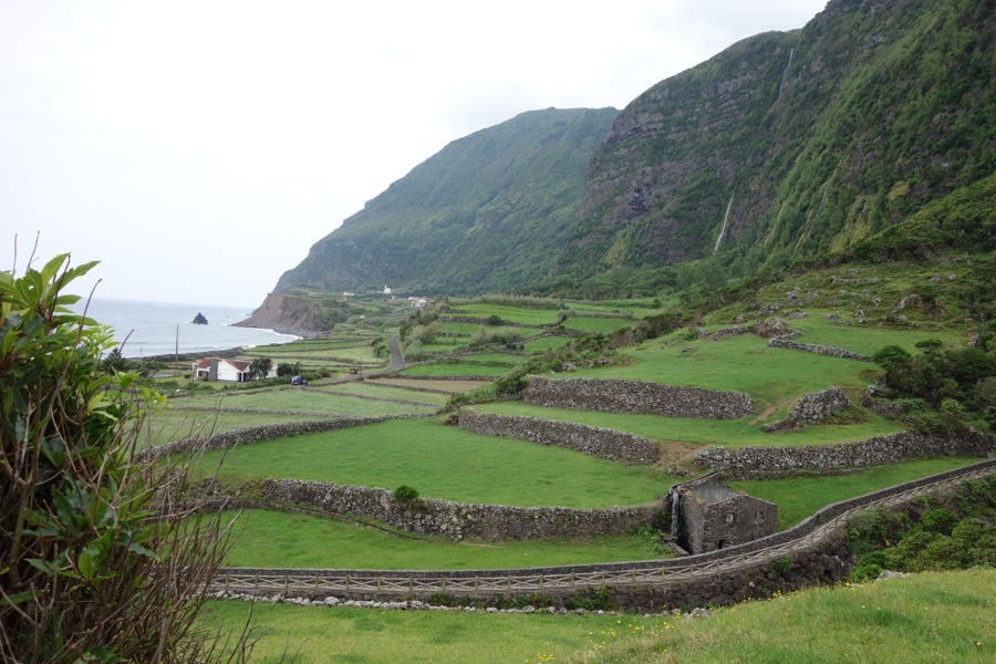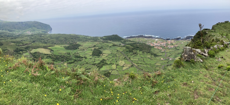 Do cimo da falésia, eis a Fajãzinha à esquerda e a Fajã Grande adiante. Socalcos numa, parcelas na outra. Verde por todo o lado. Que maravilha. São vistas destas que se ganham quando nos propomos a caminhar pela ilha das Flores.