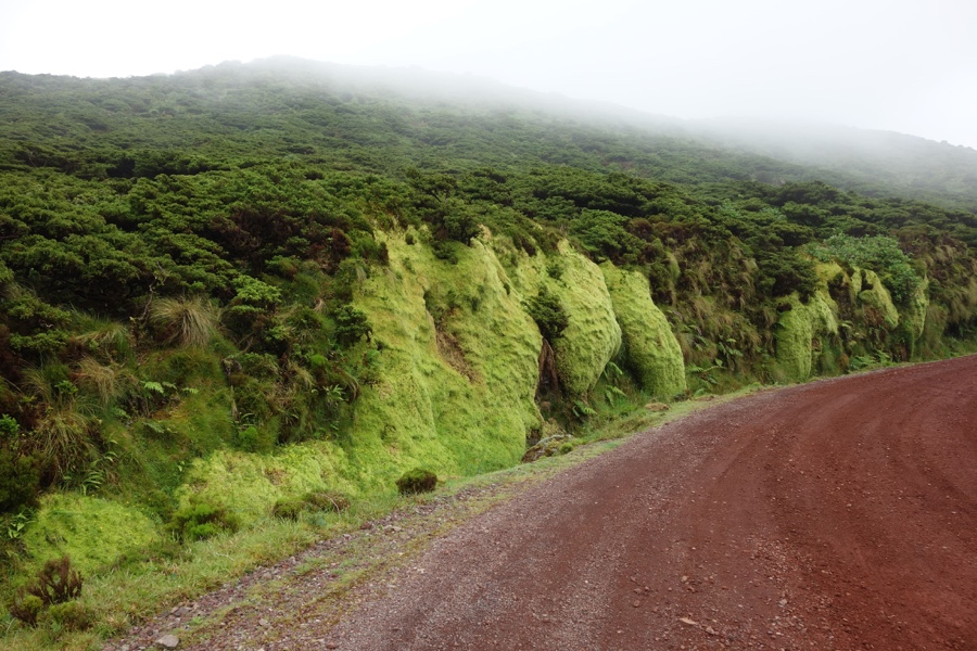 O Morro Alto é a maior elevação da ilha, a 914 metros de altitude, e desde o alto vigia todas estas caldeiras (e muito mais) por onde temos passado. Podemos conduzir até lá pela estrada de bagacina que agora iremos tomar. Um caminho de terra vermelha, para adicionar ainda mais colorido ao passeio. O nevoeiro e o musgão nas margens do caminho tornam o ambiente místico, como se de um outro mundo se tratasse. Há flores, há fetos, há diversidade. À medida que subimos a panorâmica da caldeira Branca vai-se tornando mais e mais incrível.
