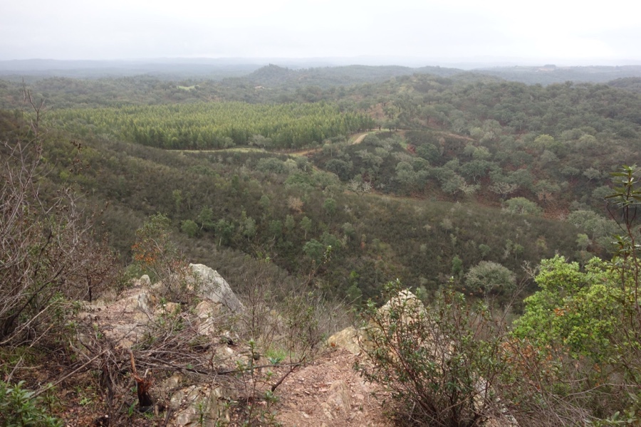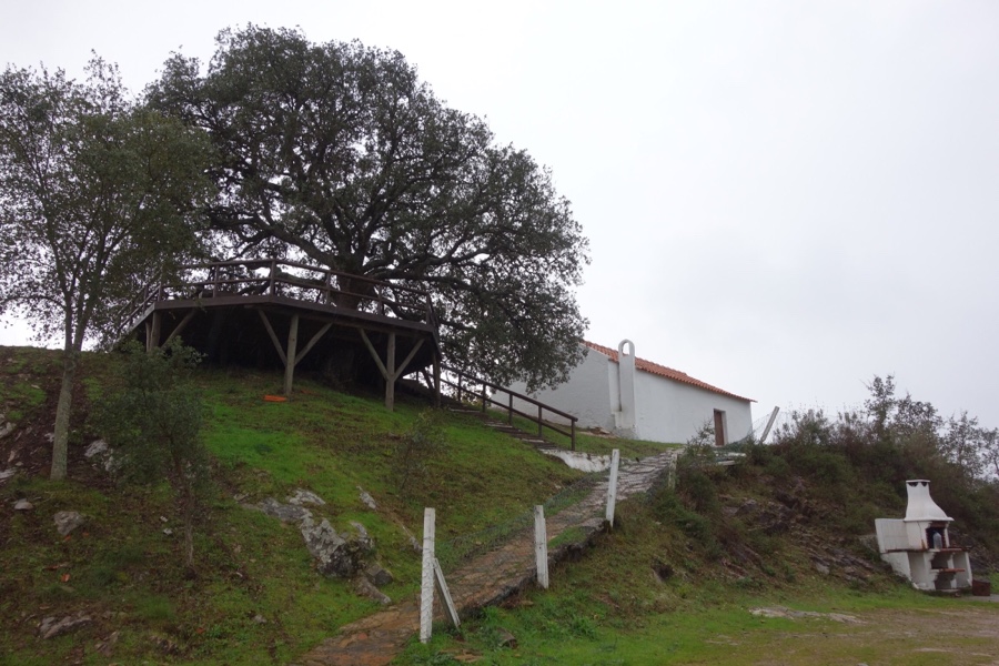 É a partir deste vale, onde prendemos ainda a atenção aos ramos grossos desnudos dos sobreiros, que começamos a subir até ao topo da colina onde mora a Ermida de Nossa Senhora das Neves. Subida extenuante, mas agradável pela paisagem altaneira e desafogada que promete a cada passo. Lá em cima, junto ao marco geodésico a 277 metros, diz-se que se vê todo o concelho de Odemira. Em dia de chuva e nublado, como o que nos tocou, não se chega a tanto, mas vê-se o suficiente para compensar não apenas a subida mas toda a jornada: para um lado são vistas de serra, numa sucessão de montinhos com vegetação que se atropelam uns aos outros, e para o outro são vistas de planície, onde descobrimos mais um monte abandonado.