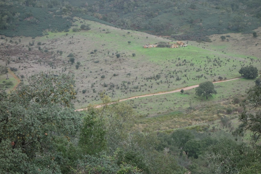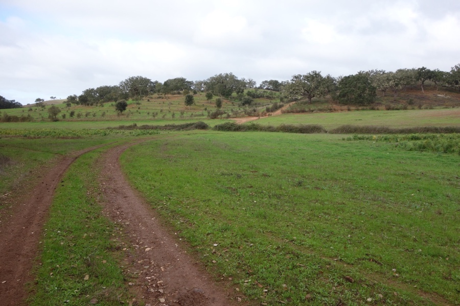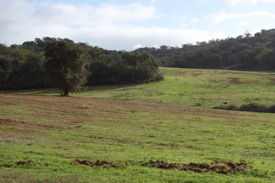 Por altura desta casa abandonada podemos virar à esquerda e iniciar a subida à colina da ermida, fazendo o percurso mais curto. Optamos por seguir mais um pouco, com o objectivo de fazer o percurso intermédio de 8 quilómetros, e não nos arrependemos. Com efeito, passada a Herdade da Figueirinha (onde está instalado o Ecoturismo da Figueirinha, com cabanas e glamping como alojamento – que cena estranha, e da qual prescindia, ver um cenário tipo safari africano em montado alentejano) abre-se um vale lindíssimo com uma zona de várzea. Mais um sinal de água e de fertilidade, ideal para a agricultura e para as ovelhas e outros animais pastarem. É pelo meio da várzea que temos de atravessar para seguir o percurso intermédio, pelo que foi inevitável assustar as ovelhas que, certamente pouco habituadas a humanos a passear nos seus domínios, rapidamente dispersaram. Mas fica o cenário inesquecível, de um verde profundo.