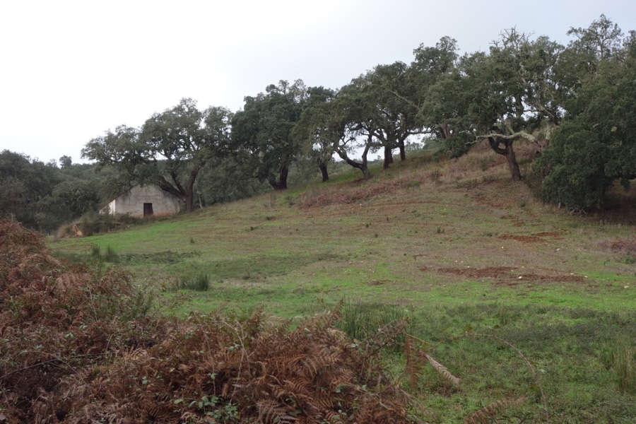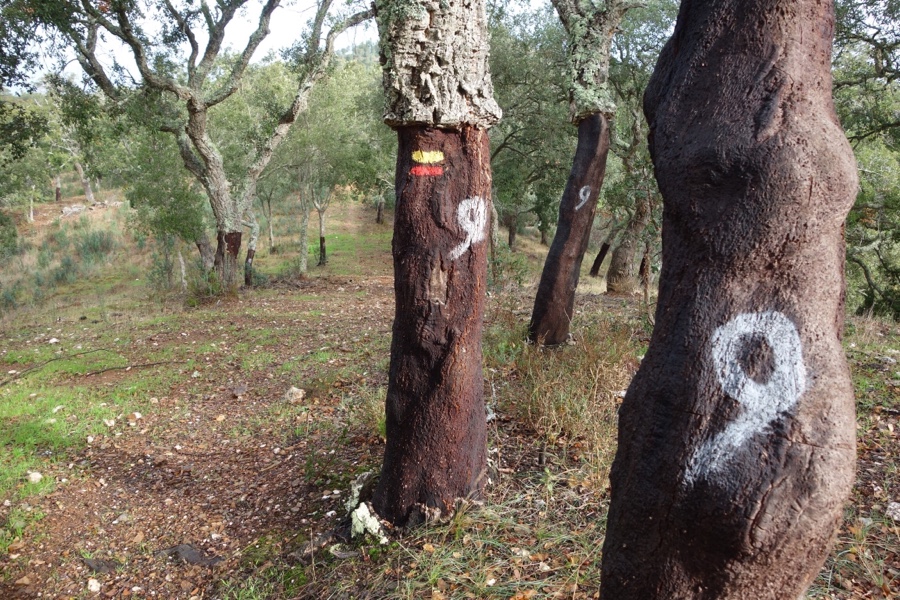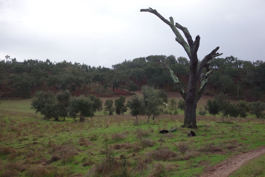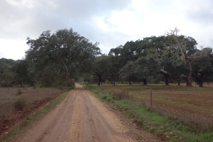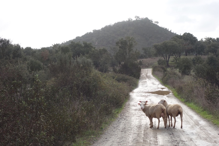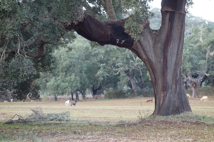 É num cruzamento largo, com espaço para estacionar, que deixamos o nosso carro e começamos a caminhar pelo interior. Num piso fácil, “de pé posto”, de tal forma que, percebemos logo, até passam carrinhas pick-up com destino ao seu labor, vemos mais umas ovelhas largadas à sombra de um sobreiro, agora para lá de uma cerca. E, bom, com esta primeira imagem fica apresentado em parte o lugar onde estamos ou, melhor, a sua economia: agropecuária e extracção de cortiça.