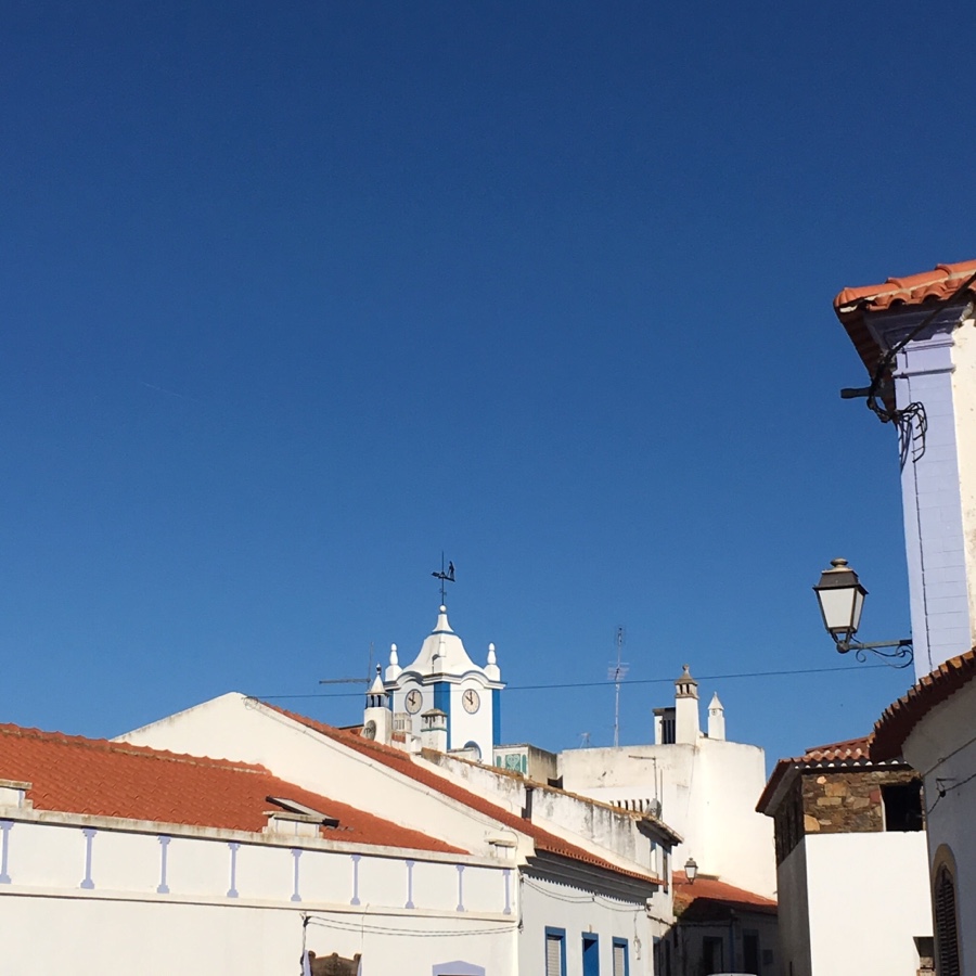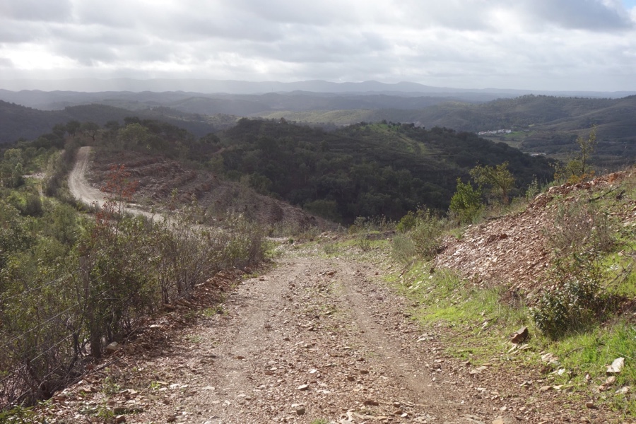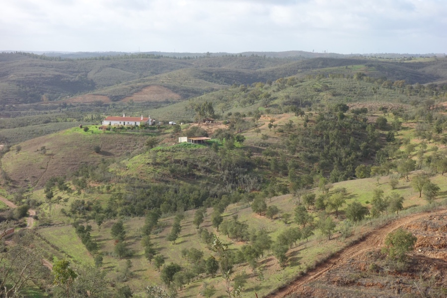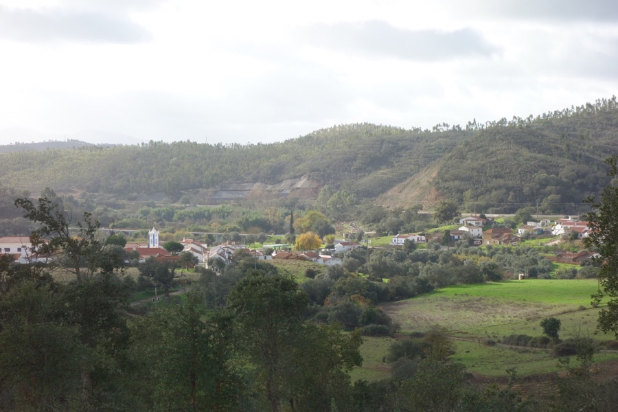 As vistas para o lado contrário são ainda mais bonitas. Ao descermos para a aldeia vemos ao fundo uma paisagem ondulante pelos montes que se sucedem. É a Serra de Monchique. Mais perto, umas habitações isoladas vão avisando que a aldeia chegará em breve. E assim acontece. Santa Clara-a-Velha aparece-nos protegida por montes e com uns relvados quase imaculados por companhia, num domínio do verde. No meio do casario, destaca-se novamente a torre da igreja e assim sabemos que voltámos à base.