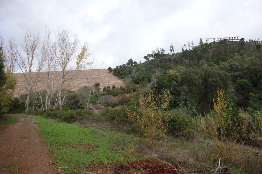 Hoje o engenho é outro: um pouco mais adiante começamos a perceber uma elevação mais contínua do terreno, já não apenas um cabeço com vegetação mas também uma extensa parede em pedra. É a estrutura da barragem de Santa a Clara e o cabeço natural vizinho tem a pousada a encimá-lo.